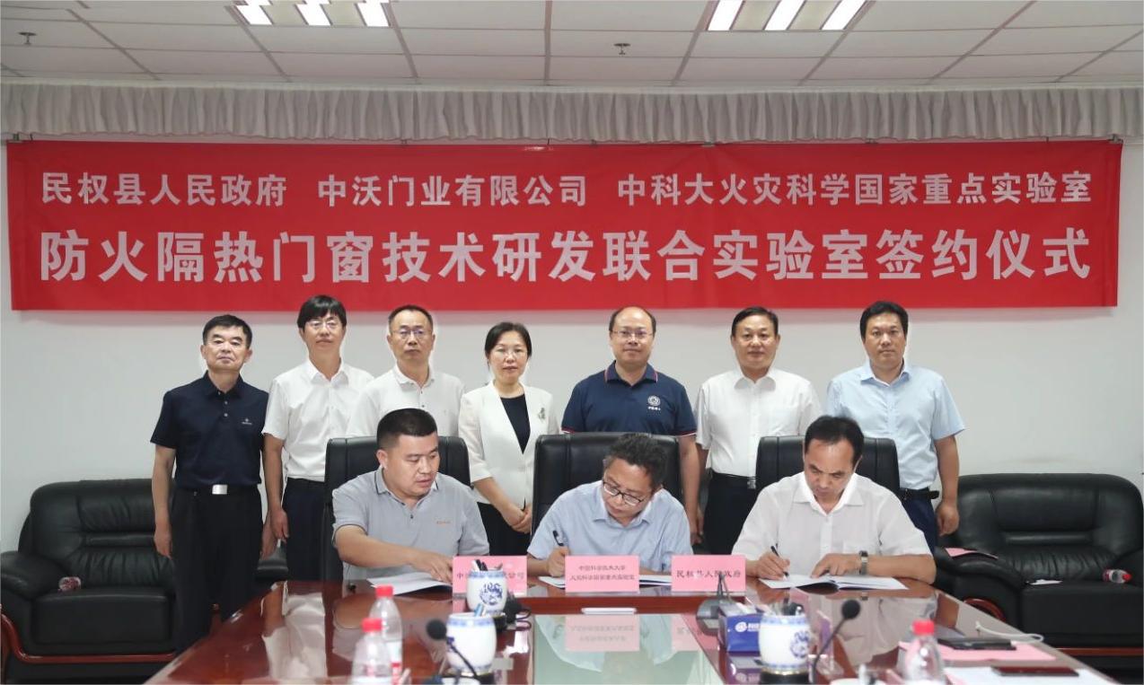 2023年8月2日,中国科学技术大学火灾科学国家重点实验室与民权县人民政府、中沃门业有限公司在民权共同建立“隔热门窗技术研发联合实验室”签约仪式在安徽合肥中科大举行。中国科学技术大学火灾科学国家重点实验室主任、研究员刘乃安,国际火灾安全科学学会副主席、国家杰出青年基金获得者、火灾科学国家重点实验室副主任、研究员胡隆华,民权县委书记王静娴,商丘市科技局局长庞进红,中沃门业董事长闫鹏洋出席签约仪式。